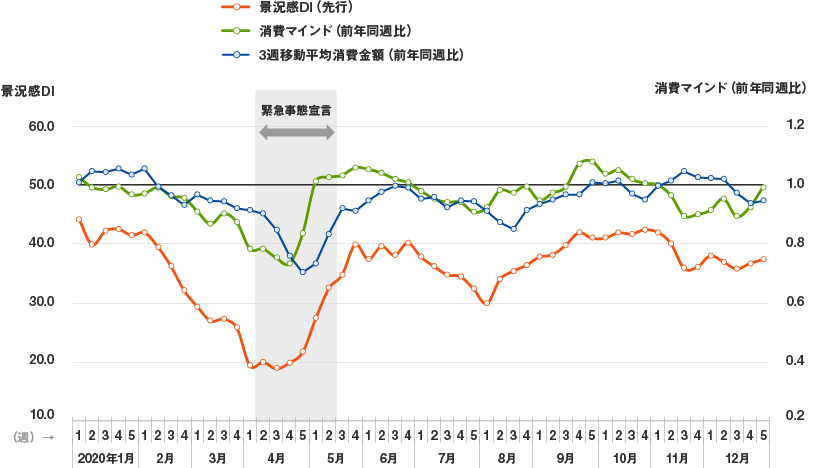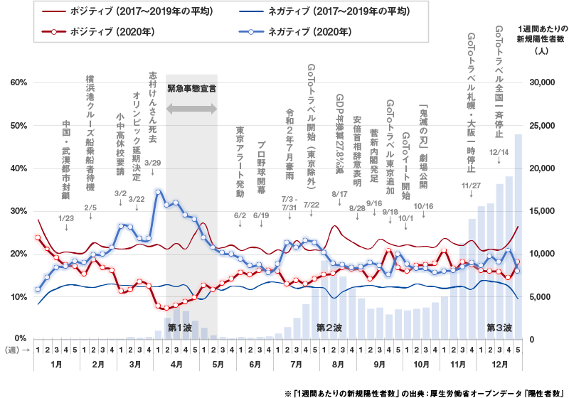 新型コロナ以前までは、ゴールデンウィークやお盆・年末年始といった消費が盛り上がるタイミングに、「ポジティブ」のスコアも高まるという傾向があった。また、「ポジティブ」のスコアを「ネガティブ」のスコアが上回るということは一度も無かった。しかし、2020年1月、中国・武漢での都市封鎖が報道されたタイミングで、初めて「ポジティブ」と「ネガティブ」が逆転、3月の小中高一斉休校の報道のタイミングで「ネガティブ」が一段上のステージへ上昇、4月の緊急事態宣言発令の直前でピークに達した。その後、緊急事態宣言の発令期間中から冷静さを取り戻し、徐々に「ネガティブ」が低下し「ポジティブ」も回復していった。