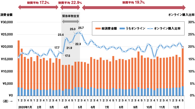 不要不急の外出が呼びかけられることが多かった2020年、オンラインでの買い物状況はどうだったのか。総消費金額とオンラインでの購入金額の比率を比べてみた。(図5)